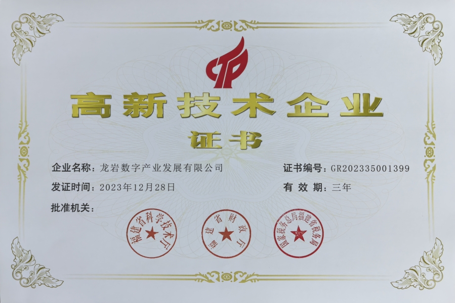 近日,龙岩数字产业发展有限公司成功通过高新技术企业认定,标志着公司在数字产业领域的创新能力和综合实力得到了充分认可与肯定(证书编号:gr202335001399)。