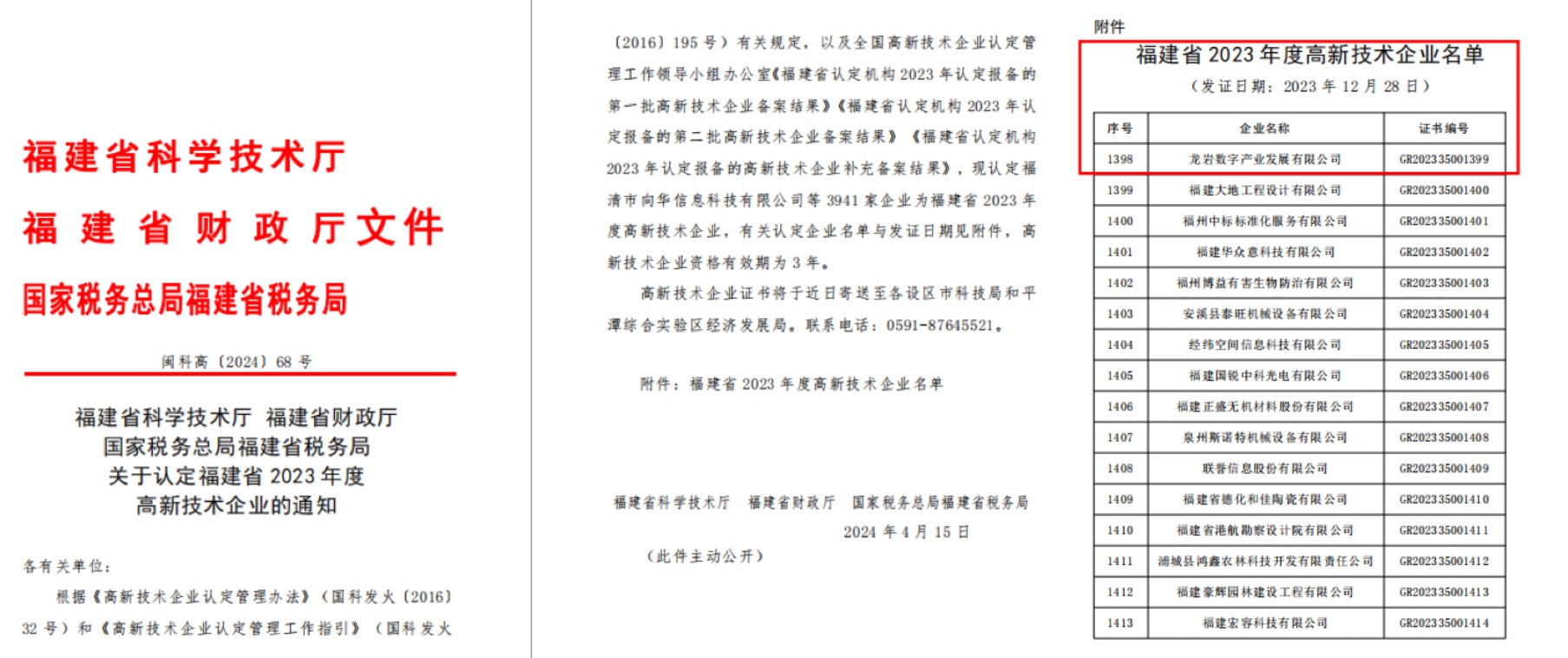 荣获高新技术企业认定,是龙岩数字产业发展有限公司发展历程中的重要里程碑,标志着公司在数字产业领域的创新能力和综合实力得到了充分认可与肯定。数产公司通过不断的技术创新和市场拓展,在数字技术研发、产品创新、市场应用等方面均取得了显著成果。2024年拓展新建了双重预防机制数字化平台等15个项目,为集团高质量发展提供有力支持。