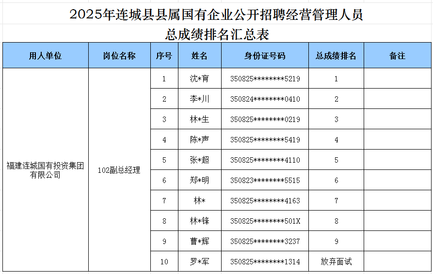 根据2025年5月8日发布的《2025年连城县县属国有企业公开招聘经营管理人员的公告》及2025年5月22日发布的《2025年连城县县属国有企业公开招聘经营管理人员延期报名的补充公告》有关要求,福建连城国有投资集团有限公司副总经理(岗位代码102)考试(面试)环节已经我司组织完成,现将总成绩排名予以公示。