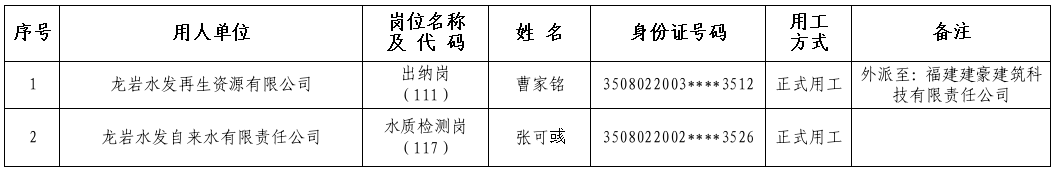 根据2025年3月28日举办的2025年龙岩市属国有企业“青春筑梦 国企同行”高校毕业生招聘会有关要求,经报名、资格审查、组织考试、体检、考察等程序,现将龙岩水发再生资源有限公司出纳岗(岗位代码111)等2个岗位拟录用人员名单公示如下:
