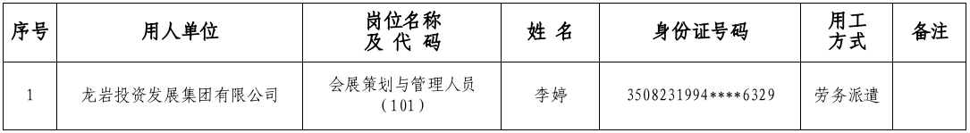 根据2025年5月6日发布的《龙岩投资发展集团有限公司关于公开招聘工作人员的公告》有关要求,经报名、资格审查、组织考试、体检、考察等程序,现将龙岩投资发展集团有限公司会展策划与管理人员(岗位代码101)拟录用人员名单公示如下: