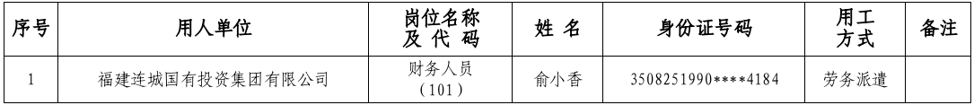 根据2025年5月14日发布的《福建连城国有投资集团有限公司关于公开招聘劳务派遣人员的公告》有关要求,经报名、资格审查、考察及体检等程序,现将福建连城国有投资集团有限公司财务人员(岗位代码101)拟录用人员名单公示如下: