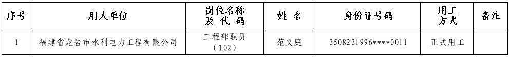 根据2025年3月26日发布的《龙岩投资发展集团有限公司所属企业关于公开遴选工作人员的公告》有关要求,经报名、资格审查、组织考试、体检、考察等程序,现将福建省龙岩市水利电力工程有限公司工程部职员(岗位代码102)拟录用人员名单公示如下: