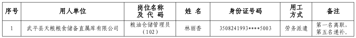 根据2024年12月18日发布的《福建武平国有投资集团有限公司及所属企业关于公开招聘工作人员的公告》有关要求,经报名、资格审查、组织考试、体检、考察等程序,现将武平县天粮粮食储备直属库有限公司粮油仓储管理员(岗位代码102)拟录用人员名单公示如下: