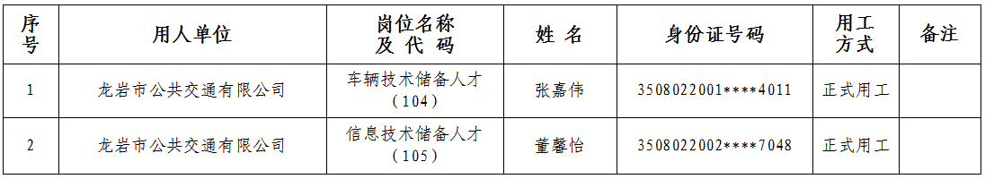 根据4月30日举办的2025年龙岩市“书记市长送岗留才进校园”专场招聘会有关要求,经报名、资格审查、组织考试、体检、考察等程序,现将龙岩市公共交通有限公司车辆技术储备人才(岗位代码104)等2个岗位拟录用人员名单公示如下: