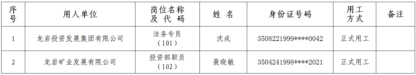 根据2025年9月4日发布的《龙岩投资发展集团有限公司及所属企业关于公开招聘工作人员的公告》有关要求,经报名、资格审查、组织考试、体检、考察等程序,现将龙岩投资发展集团有限公司法务专员(岗位代码101)等2个岗位拟录用人员名单公示如下: