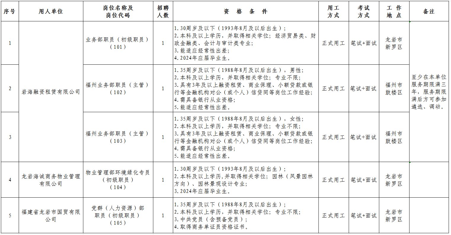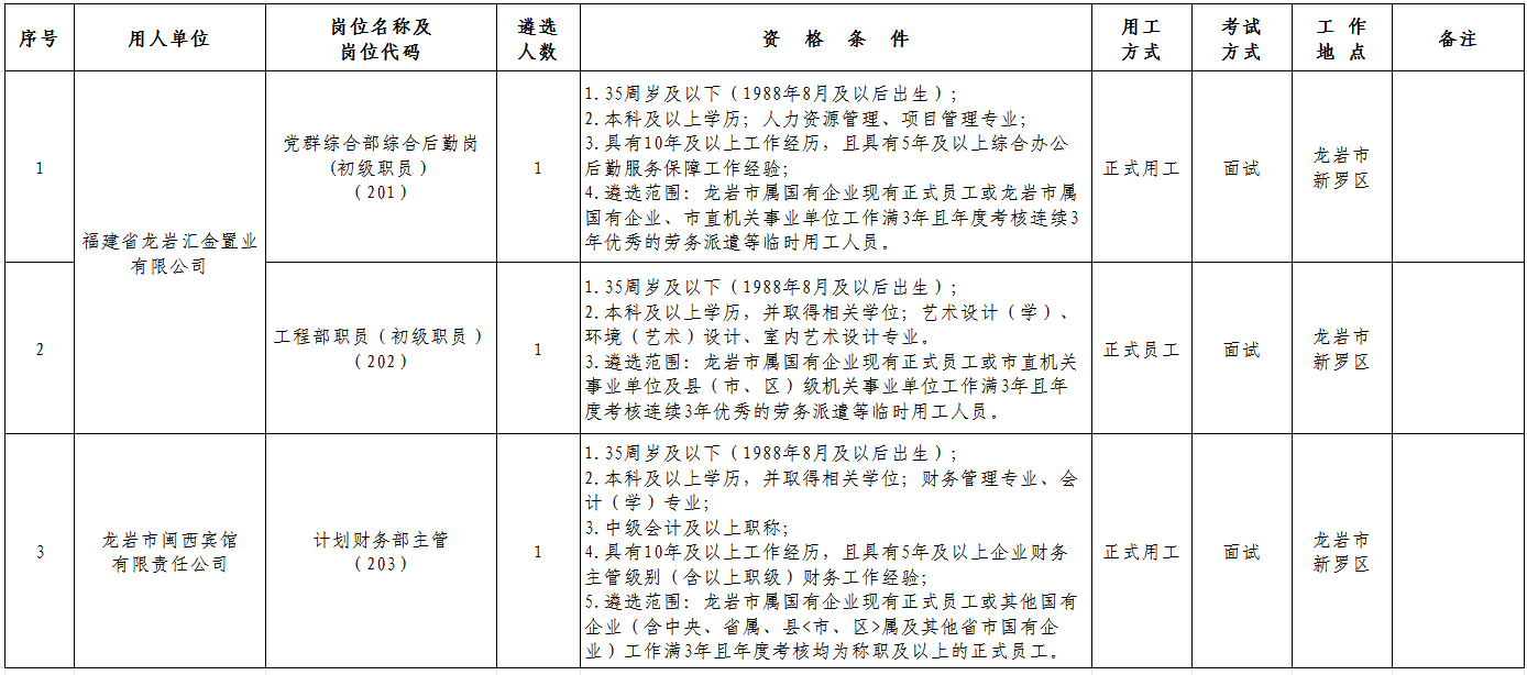 龙岩文旅汇金发展集团有限公司为龙岩市属国有企业,于2019年2月正式挂牌,属龙岩市“六大集团”之一,经营发展方向为“三大主业三项辅业”,其中主业为:金融综合服务、资产运营管理、文旅康养,辅业为:贸易、公共资源交易、地产开发。现因工作需要,拟面向社会公开招聘正式用工5名、公开遴选正式用工3名、公开招聘劳务派遣用工25名。具体公告如下:
