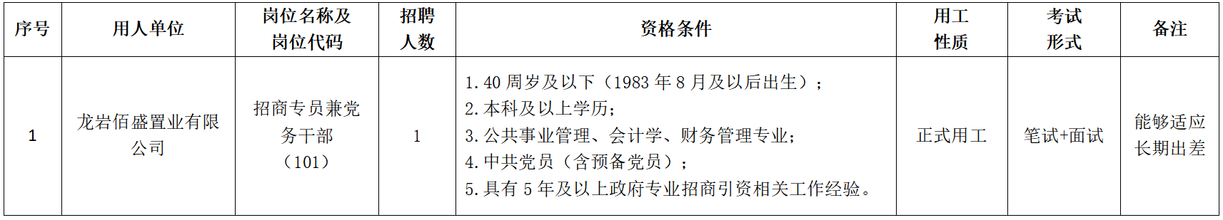 龙岩投资发展集团有限公司是市委、市政府整合机械制造、矿产资源开发、新能源、电子信息、水利水电等产业类股权投资职能和招商引资、科技孵化、创业投资等职能组建的市属国有资本投资集团,现因业务发展需要,拟公开招聘集团所属企业工作人员1名,现将有关事项公告如下: