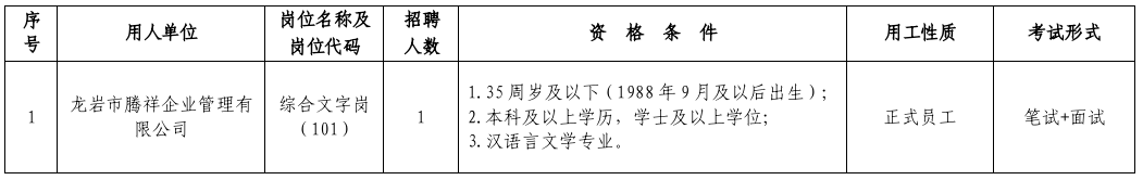 龙岩市龙腾国有资产经营发展有限公司成立于2015年12月,是一家集拍卖中介服务、人力资源服务、教育培训、进出口贸易、资产管理、房地产开发及改制留守企业管理等业务板块为一体的市属国有一级企业。现因业务发展需要,拟公开招聘公司所属企业工作人员1名,具体如下: