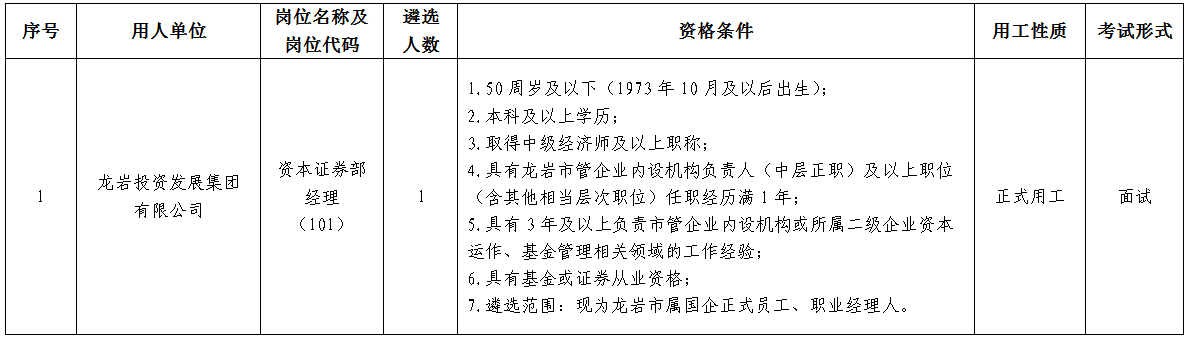 龙岩投资发展集团有限公司是市委、市政府整合机械制造、矿产资源开发、新能源、电子信息、水利水电等产业类股权投资职能和招商引资、科技孵化、创业投资等职能组建的市属国有资本投资集团,现因业务发展需要,拟公开遴选集团本部工作人员1名,现将有关事项公告如下: