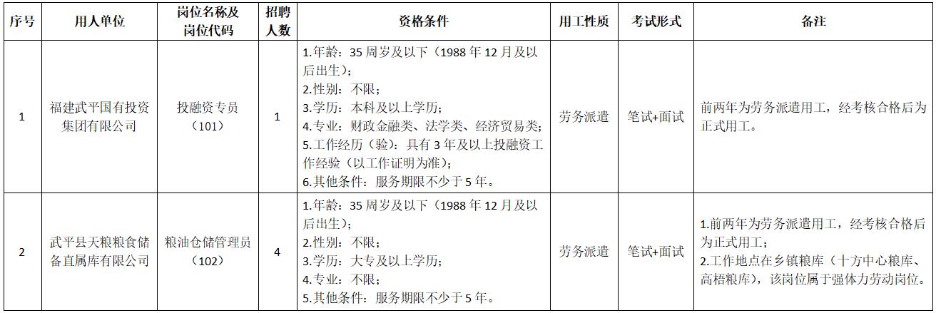 福建武平国有投资集团有限公司成立于2003年2月,为武平县财政局出资的国有独资公司,公司注册资本50000万元,主要经营对外投资和管理,水力发电,产业园区的建设、运营、投融资,非居住房地产租赁,文化旅游项目投资开发与运营,融资担保,农业产业投资与开发,市场运营管理,代理记账,工程招标代理,国家政策性粮食收储等。经研究,拟公开招聘工作人员5名,现将有关事项公告如下: