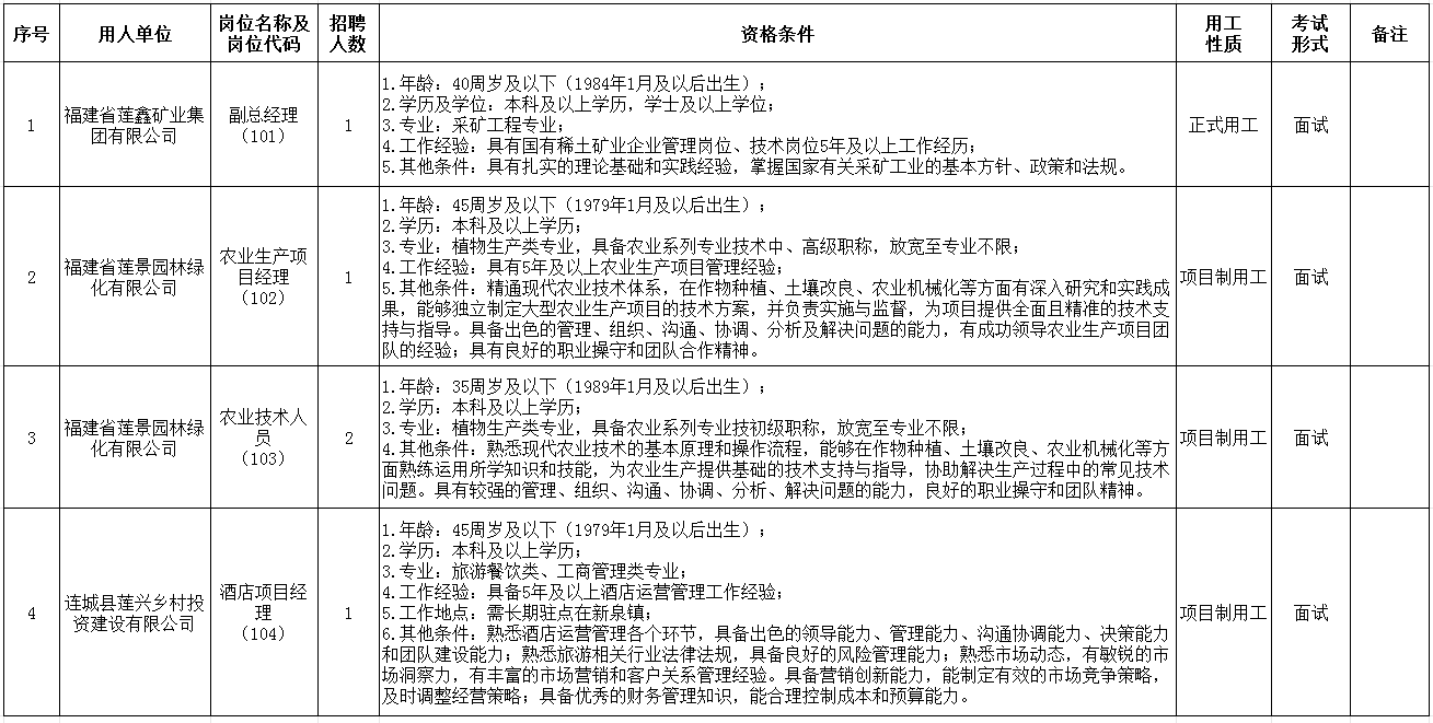 (二)福建省莲景园林绿化有限公司主要开展经营活动有:土地流转、新增耕地、建设高标准农田、农田生产经营(含销售)、农业产业投资等。根据工作安排,福建省莲景园林绿化有限公司计划在2025年与姑田镇、林坊镇、罗坊乡、莒溪镇、宣和镇、揭乐乡、赖源乡、曲溪乡、新泉镇等九个乡镇进行了土地流转对接及开展农业生产经营工作。公司现拟面向社会公开招聘项目用工人员3名。