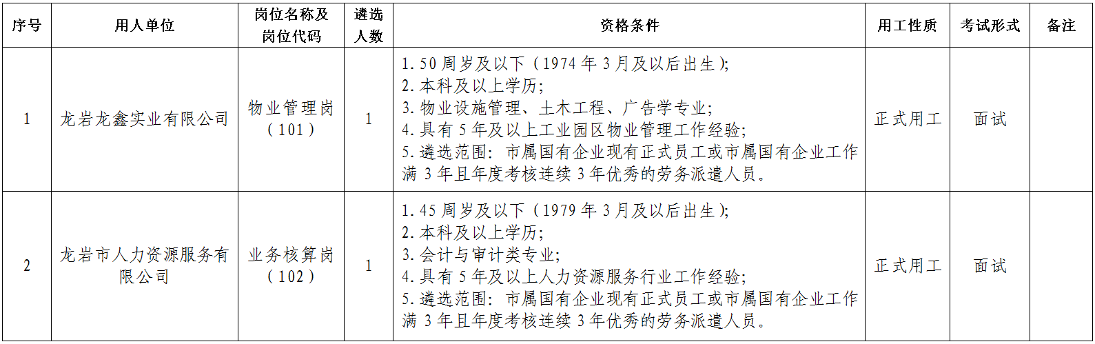 龙岩人才和大数据发展集团有限公司以市场和效益为导向,致力打造成我市全产业链人力资源服务和数字经济发展国有龙头骨干企业,立足贯彻人才强市战略,围绕我市产业转型升级和经济社会发展人才需求,提供人才综合服务和支撑;聚焦壮大我市数字经济,服务数字龙岩建设,推动全市数字产业化、产业数字化,助力我市数字经济高质量发展。现因业务发展需要,拟公开遴选所属企业工作人员2名,现将有关事项公告如下: