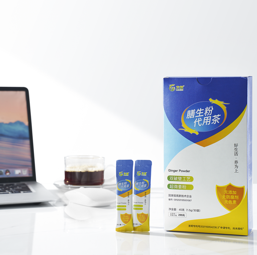 膳生粉代用茶:原料采用优质的小黄姜,通过我司与复旦大学药学院共同研发的“结合多层次微发酵法的植物类中药材超微制粉工艺”加工而成,做到药效提高,有效物质溶出率高,易于吸收,能够以最小剂量达到最大功效。