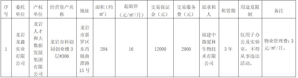 开户行:厦门银行股份有限公司龙岩分行,户名:龙岩市产权交易中心有限公司,账号:80110120420000825(报名参加的竞租人与缴纳交易保证金的名称要一致)。